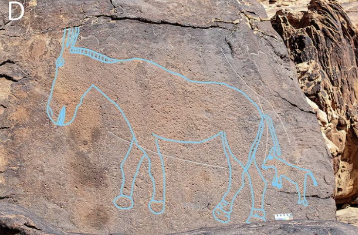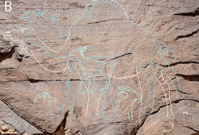 نحتت مجتمعات الصيد والبحث عن القوت التي سكنت رقعة من الصحراء العربية قبل حوالي 12 ألف عام صورا بالحجم الطبيعي لإبل وحيوانات أخرى على صخور وجروف من الحجر الرملي باستخدام الفن الصخري لتحديد مواقع مصادر المياه مما يوضح طريقة تعامل الإنسان القديم مع بعض من أكثر المناطق وعورة على الأرض. وقال باحثون إنه تم اكتشاف هذا الفن الصخري الضخم في جنوب صحراء النفود بشمال السعودية في مواقع تمتد على مسافة 30 كيلومترا تقريبا داخل تضاريس جبلية.